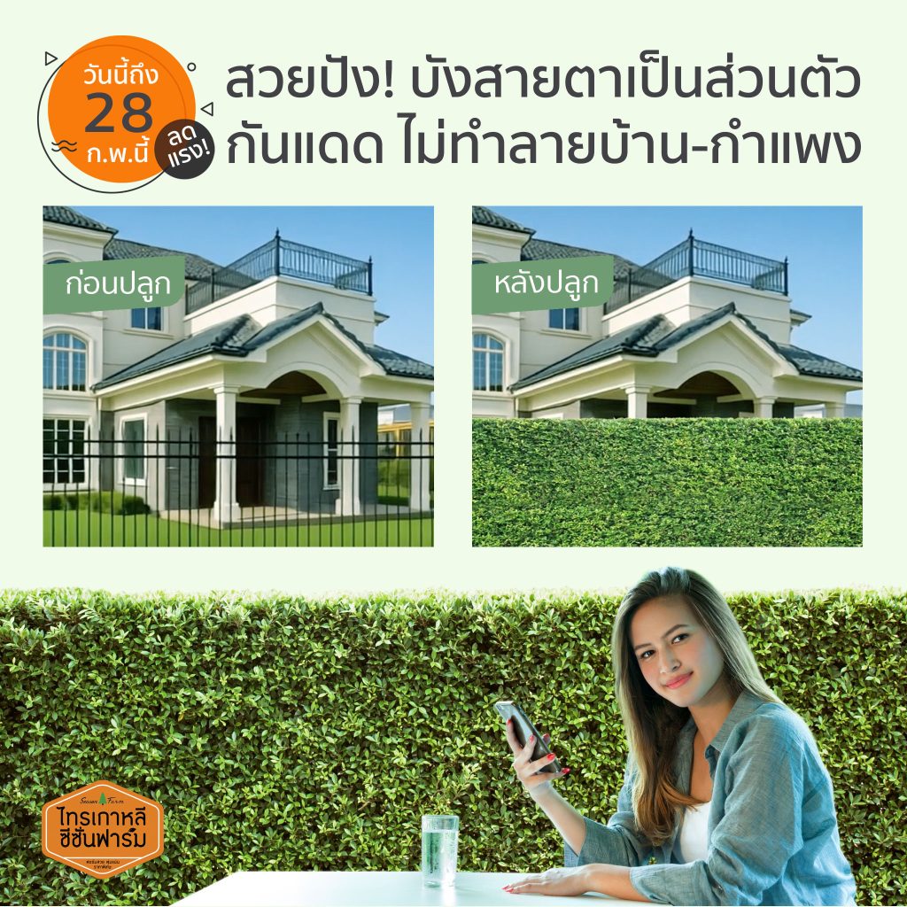 ปลูกปุ๊บ สวยปั๊บ ไม่ต้องทำรั้วหรือกำแพงแล้วแถมยังประหยัดเงินเป็นหมื่นเป็นแสนบาทได้อีกด้วย ไม่ว่าท่านจะอยู่ที่ใดในประเทศ ทั้งโรงแรม รีสอร์ต สนามกอล์ฟ โรงงาน ร้านอาหาร คอนโดมีเนียม บ้านจัดสรร บ้านเดี่ยว ทาวน์เฮาส์ ฯลฯ