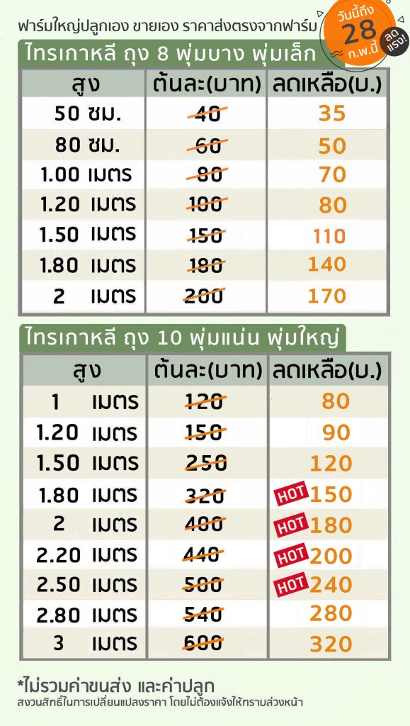 ถุง 10 และ ถุง 8 คือสเปคของต้นไม้ นอกจากความสูงแล้ว ขนาดของถุงก็มีความสำคัญ เพราะขนาดถุงของต้นไทรเกาหลีมีผลโดยตรงกับขนาดต้น ความแข็งแรง และระยะเวลาที่ใช้จนแน่นเป็นแนวรั้ว